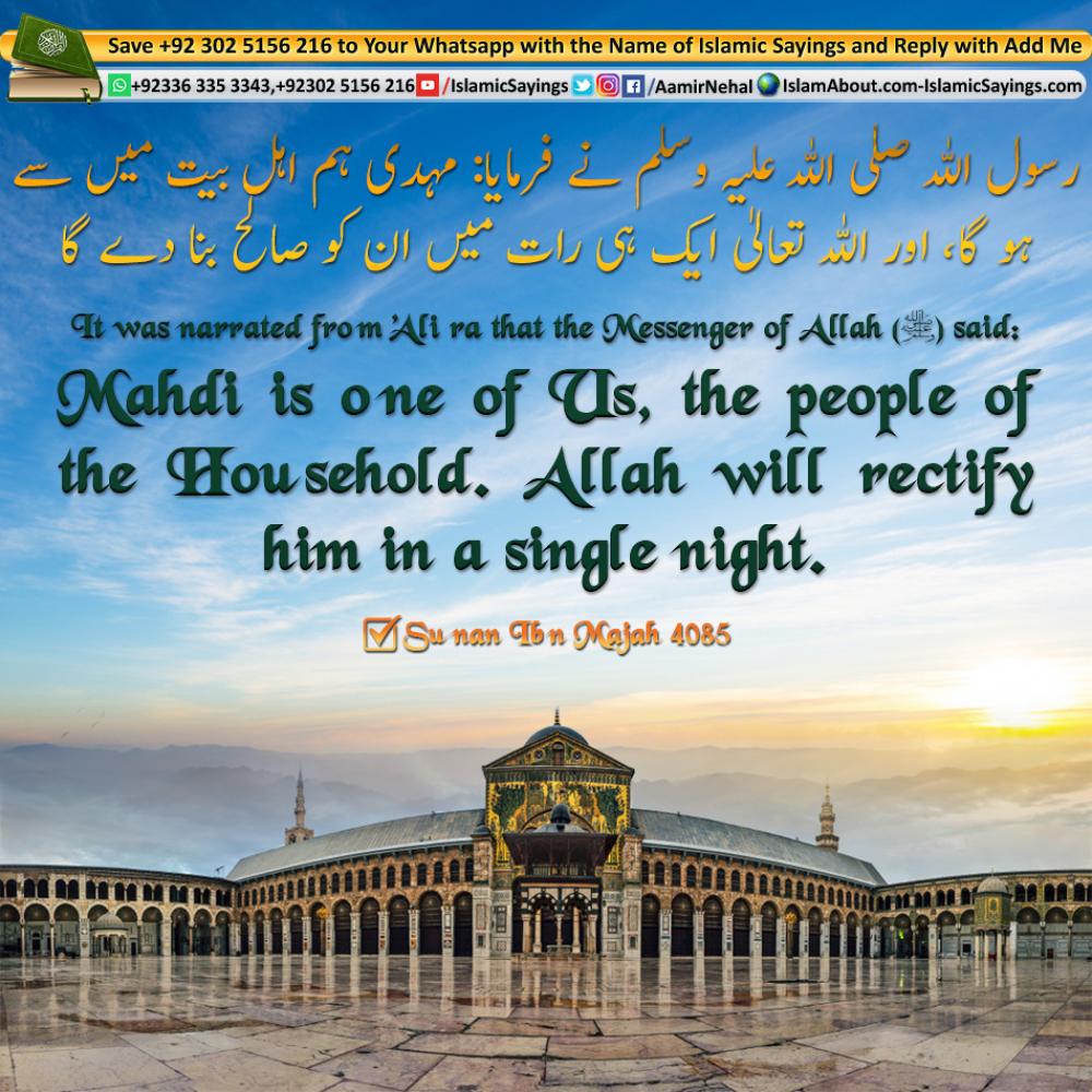 It was narrated from 'Ali that the Messenger of Allah (ﷺ) said: Mahdi is one of us, the people of the Household. Allah rectifying him in a single night.