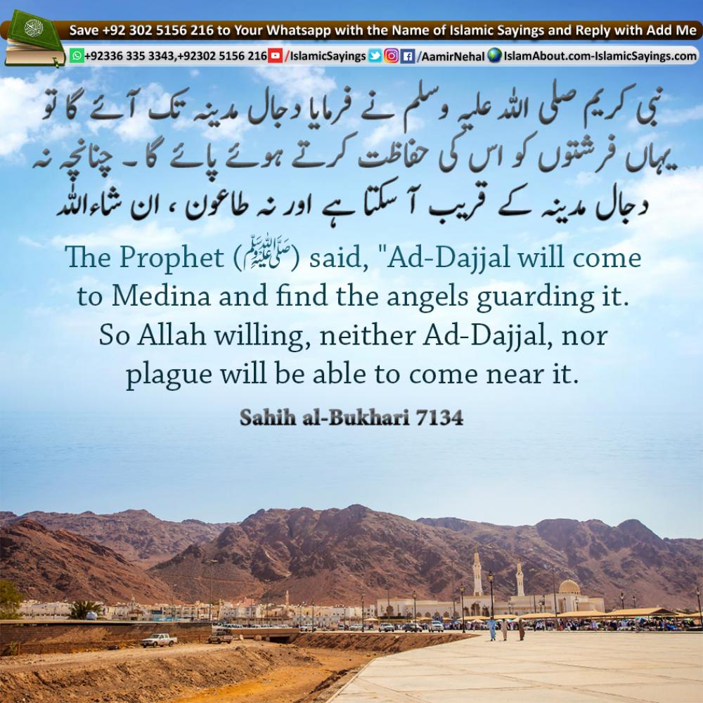 Narrated Anas bin Malik: The Prophet said, Ad-Dajjal will come to Medina and find the angels guarding it. So Allah willing, neither Ad-Dajjal, nor plague will be able to come near it.