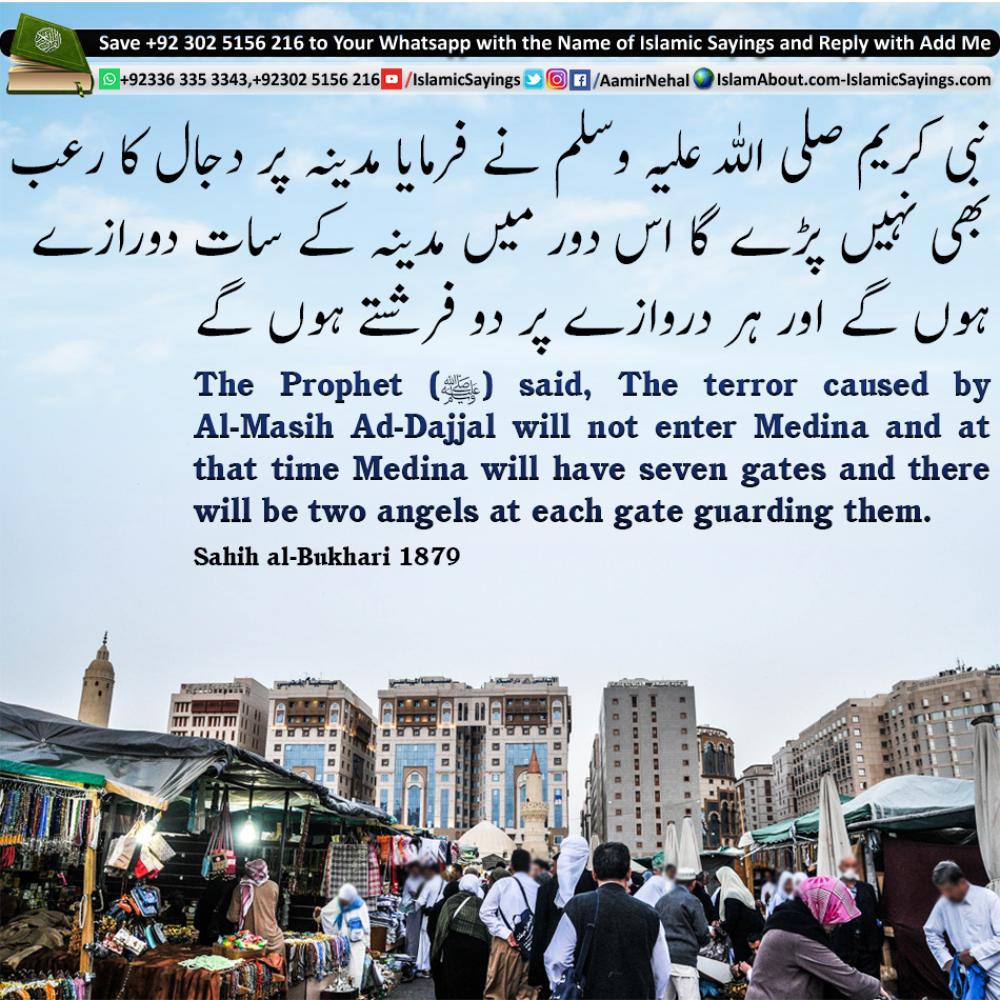 Narrated Abu Bakra: The Prophet said, The terror caused by Al-Masih Ad-Dajjal will not enter Medina and at that time Medina will have seven gates and there will be two angels at each gate guarding them.
