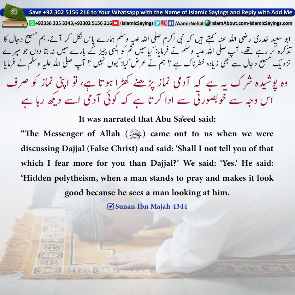 It was narrated that Abu Sa’eed said: “The Messenger of Allah (ﷺ) came out to us when we were discussing Dajjal (False Christ) and said: ‘Shall I not tell you of that which I fear more for you than Dajjal?’ We said: ‘Yes.’ He said: ‘Hidden polytheism, when a man stands to pray and makes it look good because he sees a man looking at him.’”