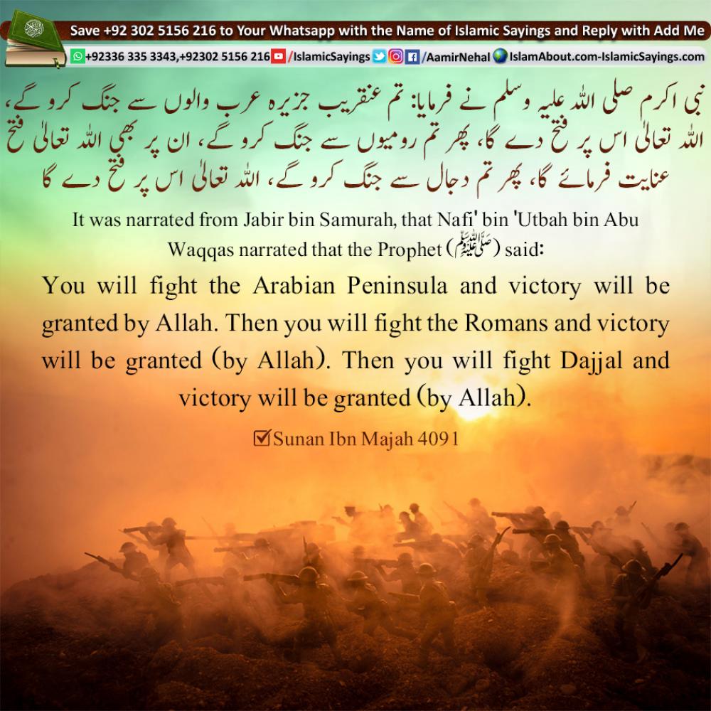 It was narrated from Jabir bin Samurah, that Nafi' bin 'Utbah bin Abu Waqqas narrated that the Prophet (ﷺ) said: You will fight the Arabian Peninsula and victory will be granted by Allah. Then you will fight the Romans and victory will be granted (by Allah). Then you will fight Dajjal and victory will be granted (by Allah). Jabir said: Dajjal will not appear until you have fought the Romans.