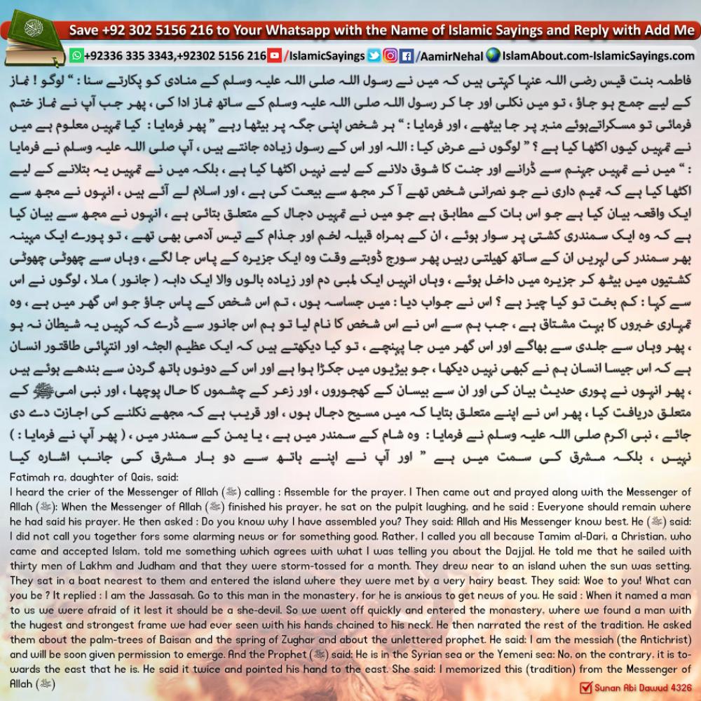 Fatimah, daughter of Qais, said: I heard the crier of the Messenger of Allah صلی اللہ علیہ وسلم calling: Assemble for the prayer. I Then came out and prayed along with the Messenger of Allah صلی اللہ علیہ وسلم: When the Messenger of Allah صلی اللہ علیہ وسلم finished his prayer, he sat on the pulpit laughing, and he said: Everyone should remain where he had said his prayer. He then asked: Do you know why I have assembled you because Tamim al-Dari, a Christian, who came and accepted Islam, told me something which agrees with what I was telling you about Lakhm and judhism and that they were storm-tossed for a month. They drew near to an island when the sun was setting. They sat in a boat nearest to them and entered the island where they were met by a very hairy beast. They said: Woe to you! What can you be ? It repled: I am the Jassasah. Go to this man in the monastery, for he is anxious to get news of you. He said: When it named a man to us we were afraid of it least it should be a she-devil. So we went off quickly and entered the monastery, where we found a man with the hugest and strongest frame we had ever seen with his hand joined to his neck. He then narrated the rest of the tradition. He asked them about the palm-trees of Baisan and the spring of Zughar and about the unlettered prophet. He said: I am the messiah (the Antichrist) and will be soon Syrian sea or the Yemen sea: no, on the contrary, it is towards the east that he is. He said it teice and ponted his hand to the east. She said: I memorized this (tradition) from the Messenger of Allah صلی اللہ علیہ وسلم, And she narrated the tradition.