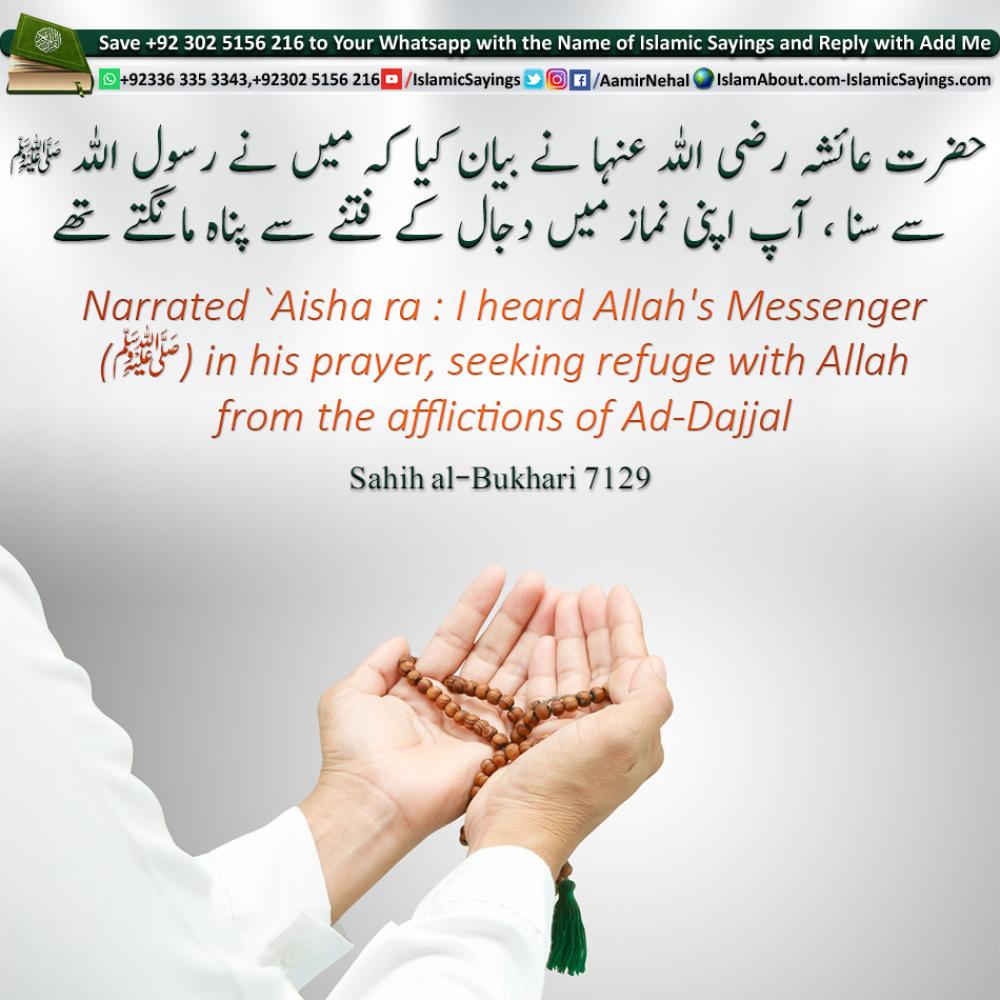 Narrated `Aisha: I heard Allah's Apostle in his prayer, seeking refuge with Allah from the afflictions of Ad-Dajjal.