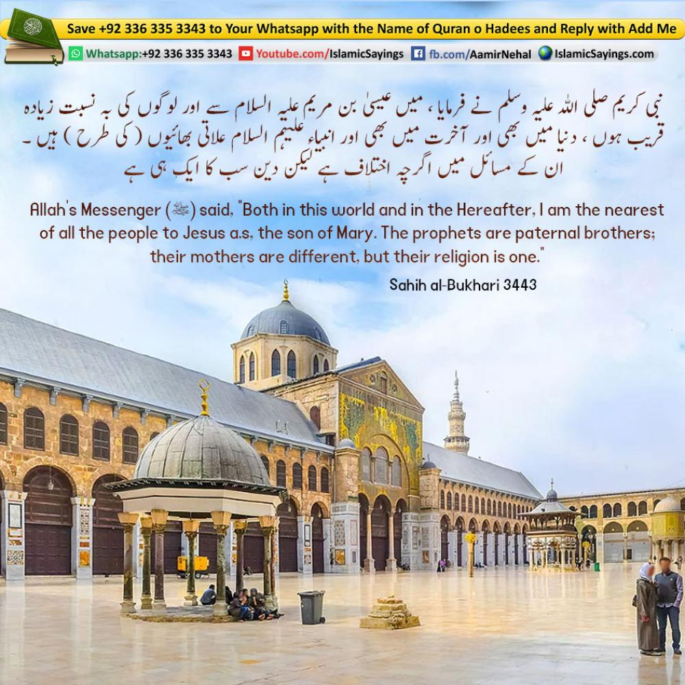 Narrated Abu Huraira: Allah's Apostle said, Both in this world and in the Hereafter, I am the nearest of all the people to Jesus, the son of Mary. The prophets are paternal brothers; their mothers are different, but their religion is one.