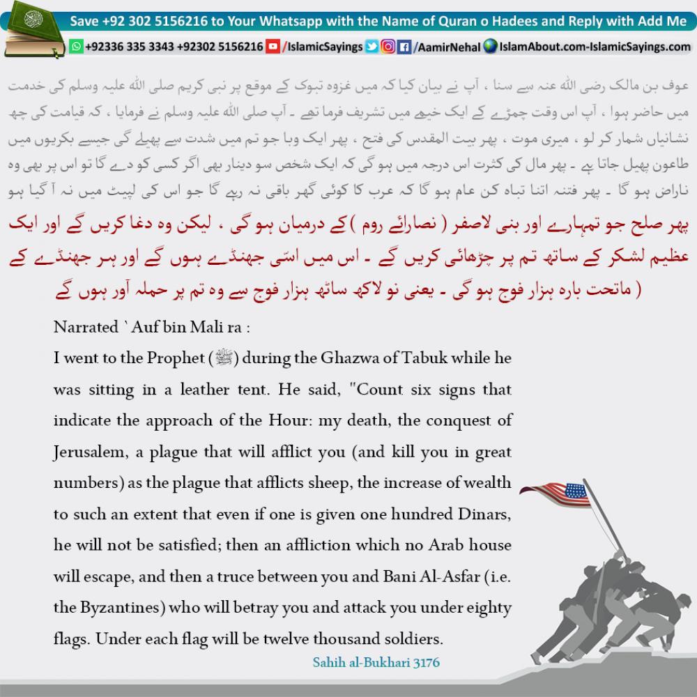 Narrated `Auf bin Mali: I went to the Prophet during the Ghazwa of Tabuk while he was sitting in a leather tent. He said, Count six signs that indicate the approach of the Hour: my death, the conquest of Jerusalem, a plague that will afflict you (and kill you in great numbers) as the plague that afflicts sheep, the increase of wealth to such an extent that even if one is given one hundred Dinars, he will not be satisfied; then an affliction which no Arab house will escape, and then a truce between you and Bani Al-Asfar (i.e. the Byzantines) who will betray you and attack you under eighty flags. Under each flag will be twelve thousand soldiers.
