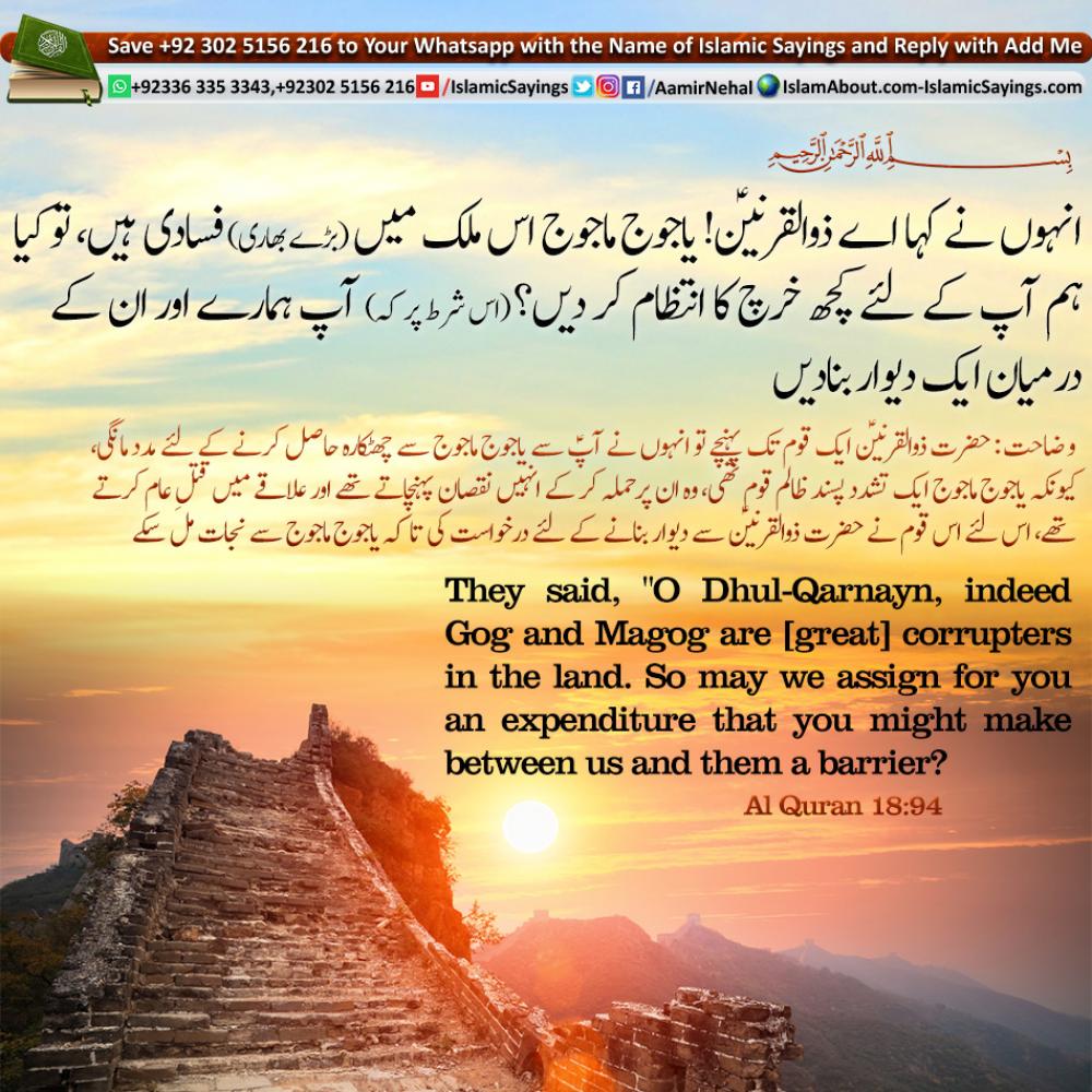 They said, "O Dhul-Qarnayn, indeed Gog and Magog are [great] corrupters in the land. So may we assign for you an expenditure that you might make between us and them a barrier?"