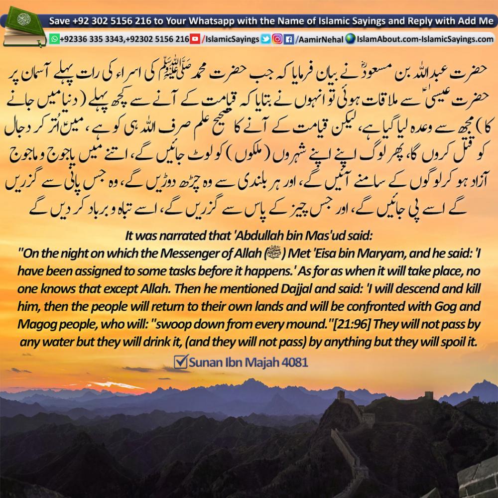 It was narrated that 'Abdullah bin Mas'ud said: On the night on which the Messenger of Allah (ﷺ) was taken on the Night Journey (Isra'), he met Ibrahim, Musa and 'Eisa, and they discussed the Hour. They started with Ibrahim, and asked him about it, but he did not have any knowledge of it. Then they asked Musa, and he did not have any knowledge of it. Then they asked 'Eisa bin Maryam, and he said: 'I have been assigned to some tasks before it happens.' As for as when it will take place, no one knows that except Allah. Then he mentioned Dajjal and said: 'I will descend and kill him, then the people will return to their own lands and will be confronted with Gog and Magog people, who will: swoop down from every mound. [21:96] They will not pass by any water but they will drink it, (and they will not pass) by anything but they will spoil it. They (the people) will beseech Allah, and I will pray to Allah to kill them. The earth will be filled with their stench and (the people) will beseech Allah and I will pray to Allah, then the sky will send down rain that will carry them and throw them in the sea. Then the mountains will turn to dust and the earth will be stretched out like a hide. I have been promised that when that happens, the Hour will come upon the people, like a pregnant woman whose family does not know when she will suddenly give birth.' (One of the narrators) 'Awwam said: Confirmation of that is found in the Book of Allah, where Allah says: Until, when Gog and Magog people are let loose (from their barrier), and they swoop down from every mound (21:96).