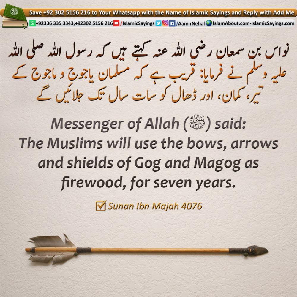 It was narrated from Nawwas bin Sam'an that the Messenger of Allah (ﷺ) said: The Muslims will use the bows, arrows and shields of Gog and Magog as firewood, for seven years.'