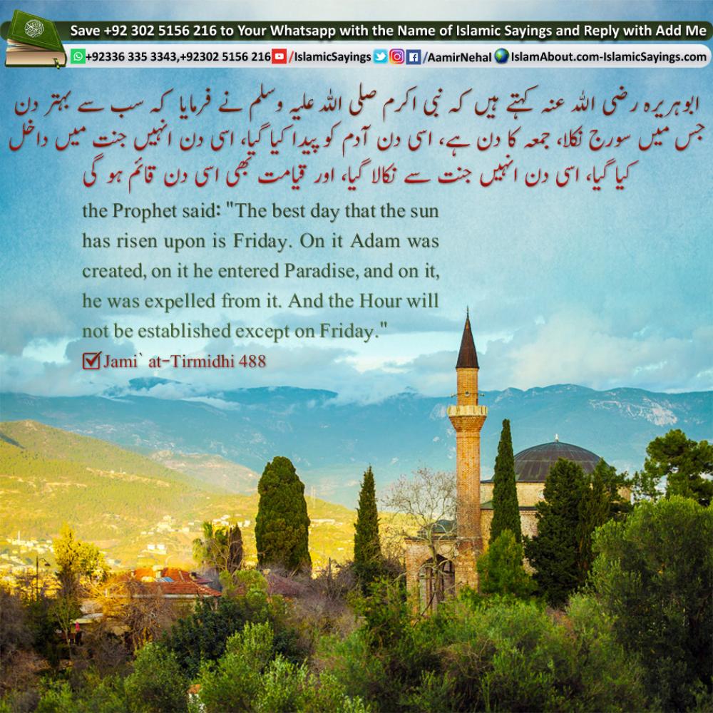 Abu Hurairah narrated that: the Prophet said: The best day that the sun has risen upon is Friday. On it Adam was created, on it he entered Paradise, and on it, he was expelled from it. And the Hour will not be established except on Friday.