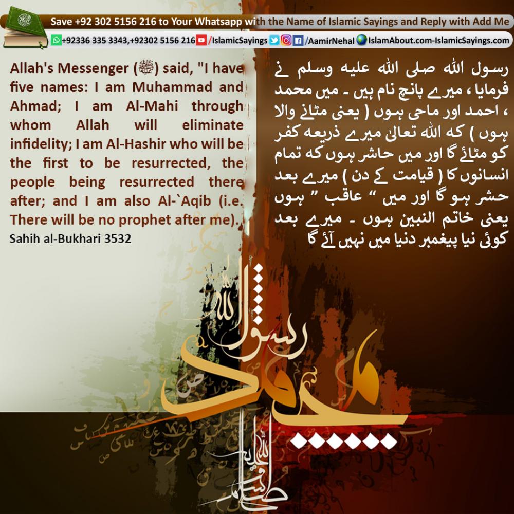Narrated Jubair bin Mut`im: Allah's Apostle said, I have five names: I am Muhammad and Ahmad; I am Al-Mahi through whom Allah will eliminate infidelity; I am Al-Hashir who will be the first to be resurrected, the people being resurrected there after; and I am also Al-`Aqib (i.e. There will be no prophet after me).