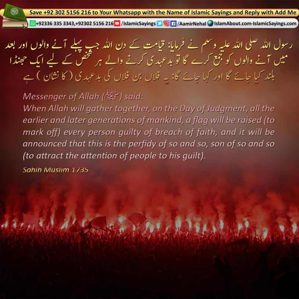 It has been narrated on the authority of Ibn 'Umar that the Messenger of Allah ( صلی اللہ علیہ وسلم ) said: When Allah will gather together, on the Day of Judgment, all the earlier and later generations of mankind, a flag will be raised (to mark off) every person guilty of breach of faith, and it will be announced that this is the perfidy of so and so, son of so and so (to attract the attention of people to his guilt).