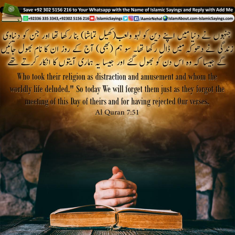 Who took their religion as distraction and amusement and whom the worldly life deluded." So today We will forget them just as they forgot the meeting of this Day of theirs and for having rejected Our verses.