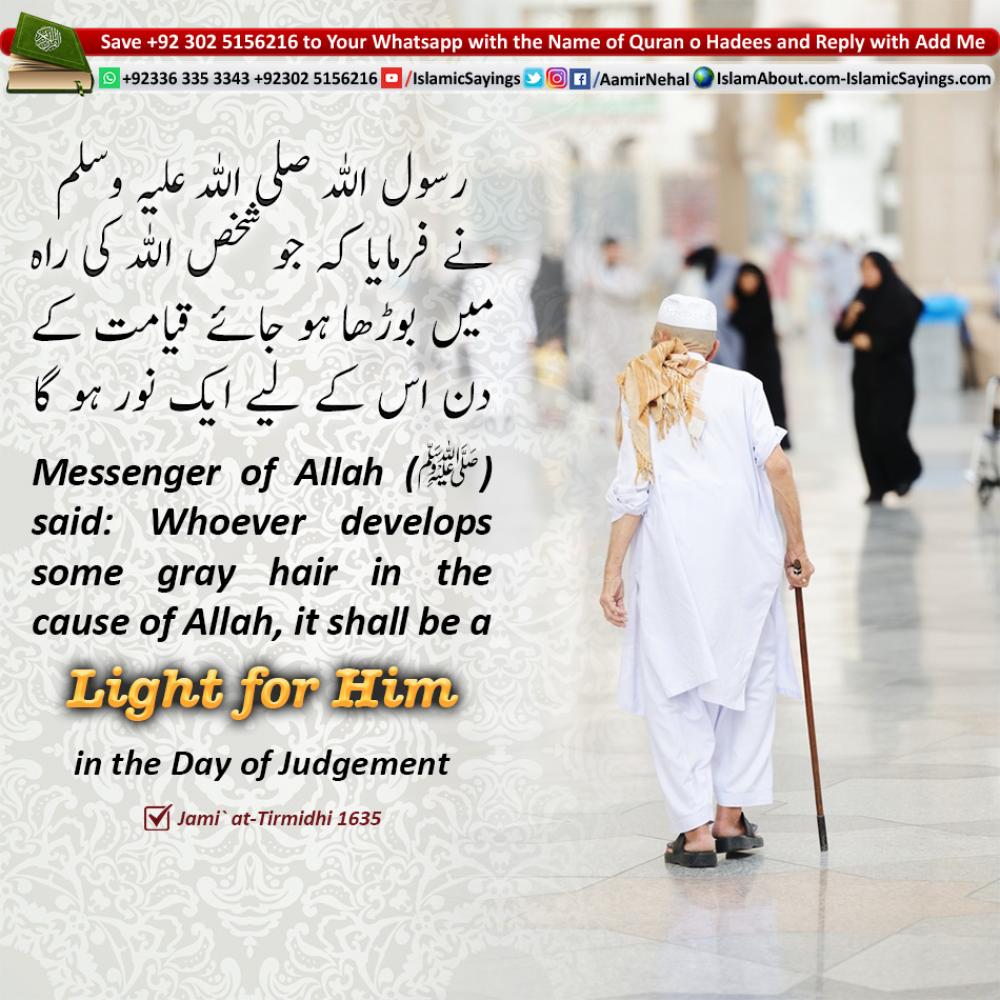 Narrated Amr bin 'Abasah: That the Messenger of Allah (ﷺ) said: Whoever develops some gray hair in the cause of Allah, it shall be a light for him in the Day of Judgement. [Abu 'Eisa said:] This Hadith is Hasan Sahih Gharib. As for Haiwah bin Shuraih, (the remainder of his name is) Ibn Yazid Al-Himsi.