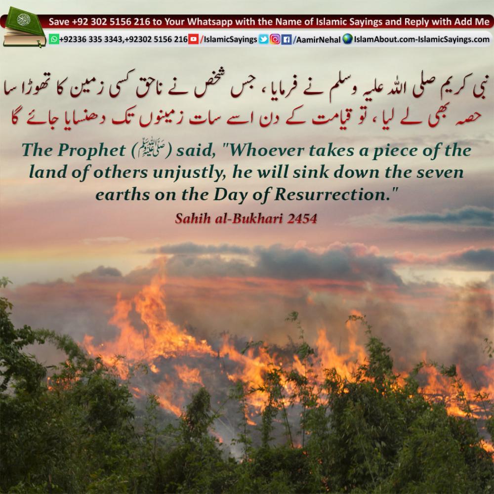 Narrated Salim's father (i.e. `Abdullah): The Prophet said, Whoever takes a piece of the land of others unjustly, he will sink down the seven earths on the Day of Resurrection.