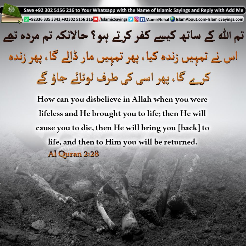 کَیۡفَ تَکۡفُرُوۡنَ بِاللّٰہِ وَ کُنۡتُمۡ اَمۡوَاتًا فَاَحۡیَاکُمۡ ۚ ثُمَّ یُمِیۡتُکُمۡ ثُمَّ یُحۡیِیۡکُمۡ ثُمَّ اِلَیۡہِ تُرۡجَعُوۡنَ ﴿۲۸﴾