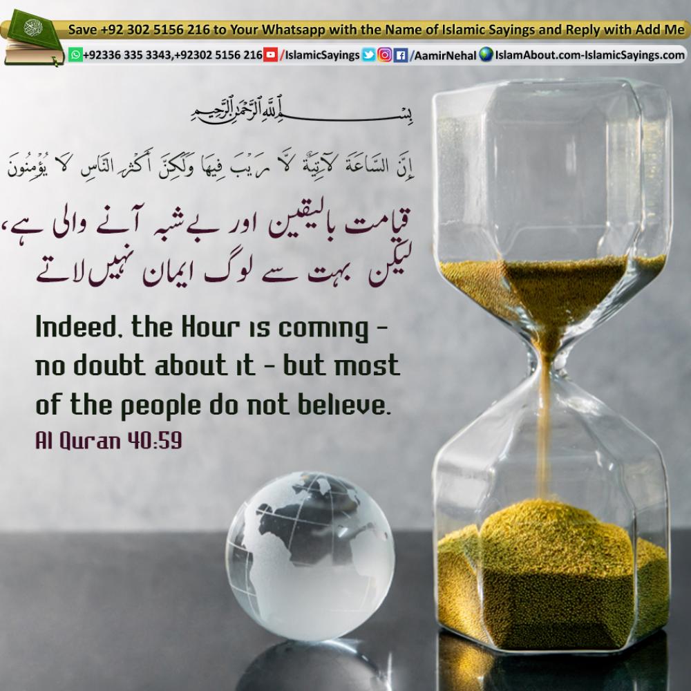 اِنَّ السَّاعَۃَ لَاٰتِیَۃٌ لَّا رَیۡبَ فِیۡہَا وَ لٰکِنَّ اَکۡثَرَ النَّاسِ لَا یُؤۡمِنُوۡنَ ﴿۵۹﴾