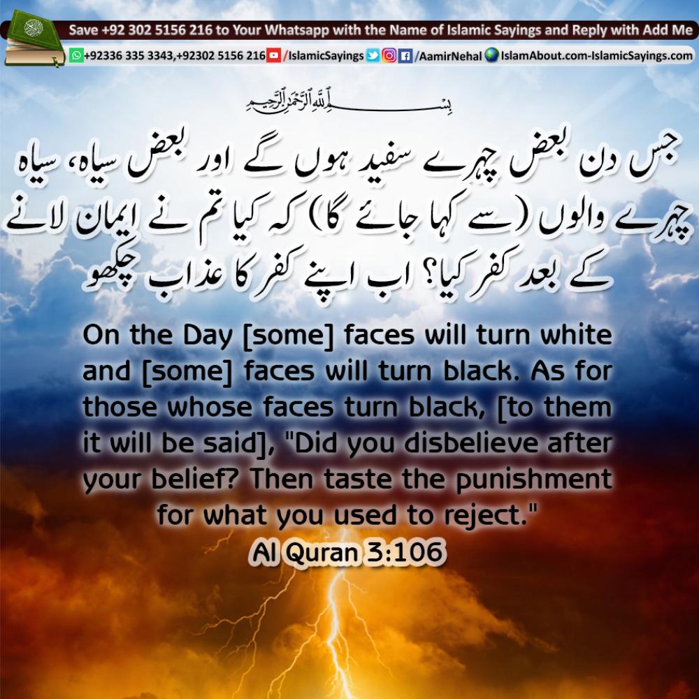 یَّوۡمَ تَبۡیَضُّ وُجُوۡہٌ وَّ تَسۡوَدُّ وُجُوۡہٌ ۚ فَاَمَّا الَّذِیۡنَ اسۡوَدَّتۡ وُجُوۡہُہُمۡ ۟ اَکَفَرۡتُمۡ بَعۡدَ اِیۡمَانِکُمۡ فَذُوۡقُوا الۡعَذَابَ بِمَا کُنۡتُمۡ تَکۡفُرُوۡنَ ﴿۱۰۶﴾