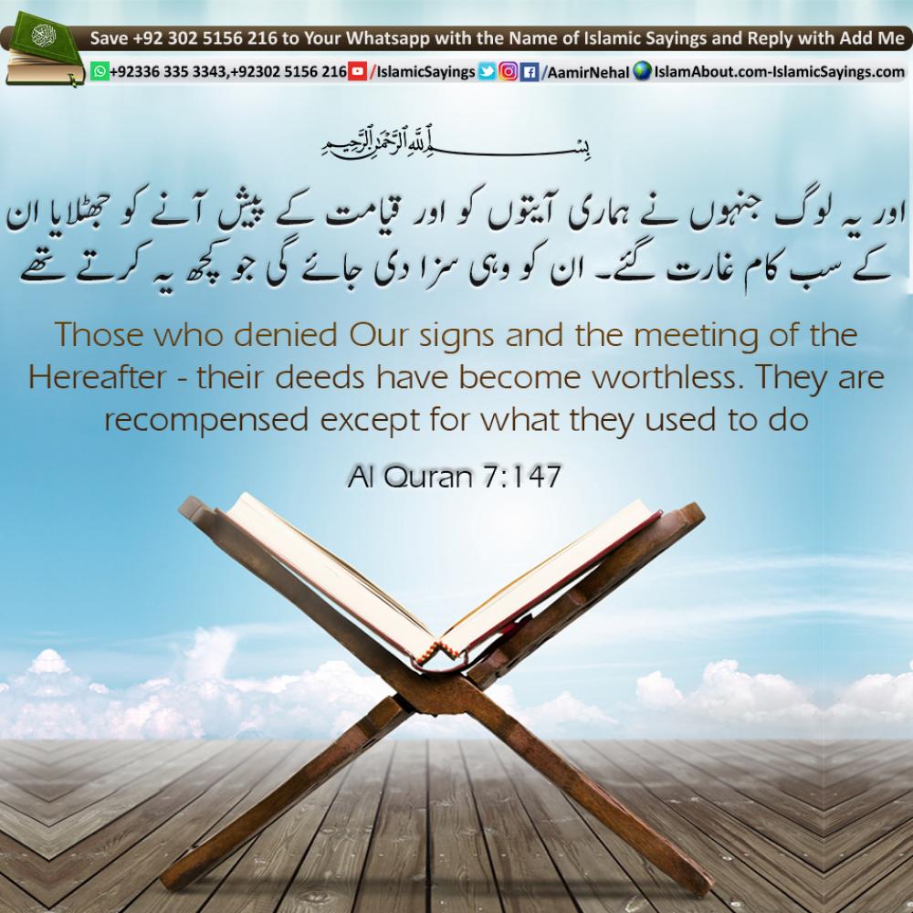 وَ الَّذِیۡنَ کَذَّبُوۡا بِاٰیٰتِنَا وَ لِقَآءِ الۡاٰخِرَۃِ حَبِطَتۡ اَعۡمَالُہُمۡ ؕ ہَلۡ یُجۡزَوۡنَ اِلَّا مَا کَانُوۡا یَعۡمَلُوۡنَ ﴿۱۴۷﴾٪ 7