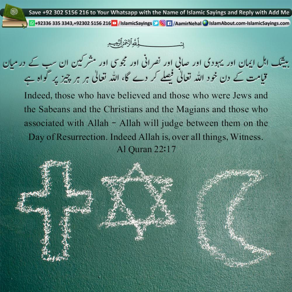 Indeed, those who have believed and those who were Jews and the Sabeans and the Christians and the Magians and those who associated with Allah - Allah will judge between them on the Day of Resurrection. Indeed Allah is, over all things, Witness.