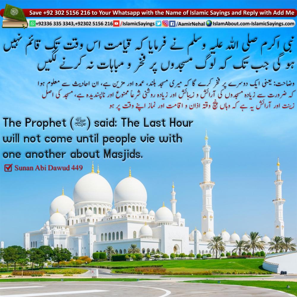Narrated Anas ibn Malik: The Prophet صلی اللہ علیہ وسلم said: The Last Hour will not come until people vie with one another about mosques.