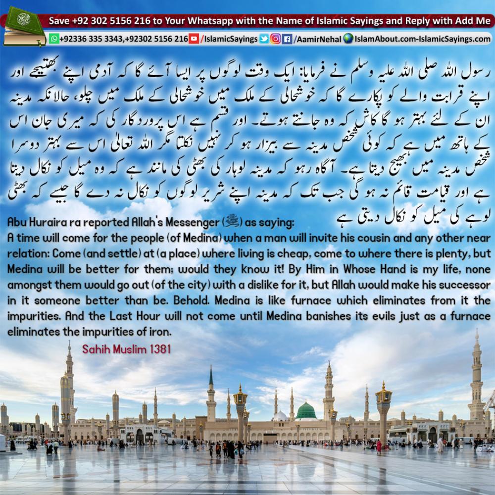 Abu Huraira (Allah be pleased with him) reported Allah's Messenger ( صلی اللہ علیہ وسلم ) as saying: A time will come for the people (of Medina) when a man will invite his cousin and any other near relation: Come (and settle) at (a place) where living is cheap, come to where there is plenty, but Medina will be better for them; would they know it! By Him in Whose Hand is my life, none amongst them would go out (of the city) with a dislike for it, but Allah would make his successor in it someone better than be. Behold. Medina is like furnace which eliminates from it the impurities. And the Last Hour will not come until Medina banishes its evils just as a furnace eliminates the impurities of iron.