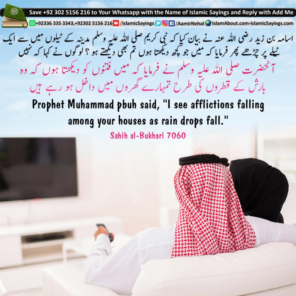Narrated Usama bin Zaid: Once the Prophet stood over one of the high buildings of Medina and then said (to the people), Do you see what I see? They said, No. He said, I see afflictions falling among your houses as rain drops fall.