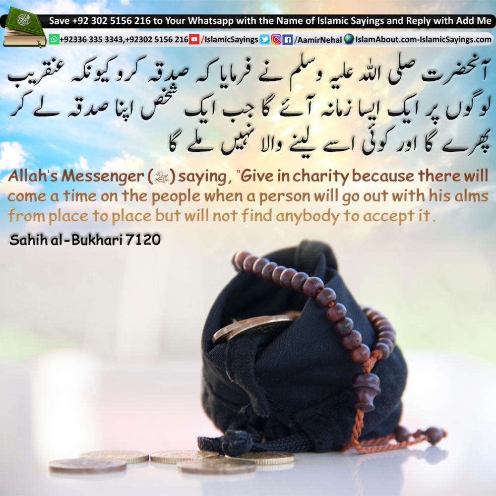 Narrated Haritha bin Wahb: I heard Allah's Apostle saying, Give in charity because there will come a time on the people when a person will go out with his alms from place to place but will not find anybody to accept it.