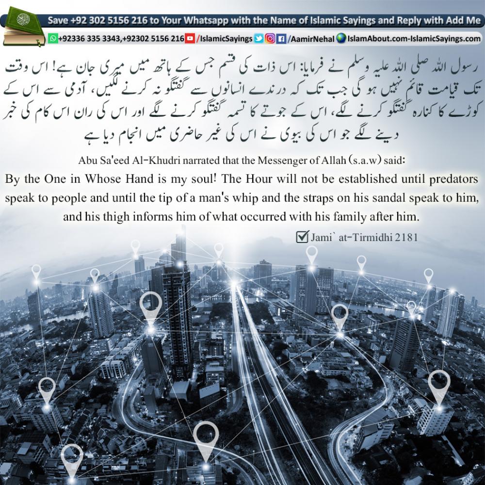 Abu Sa'eed Al-Khudri narrated that the Messenger of Allah (s.a.w) said: By the One in Whose Hand is my soul! The Hour will not be established until predators speak to people and until the tip of a man's whip and the straps on his sandal speak to him, and his thigh informs him of what occurred with his family after him.