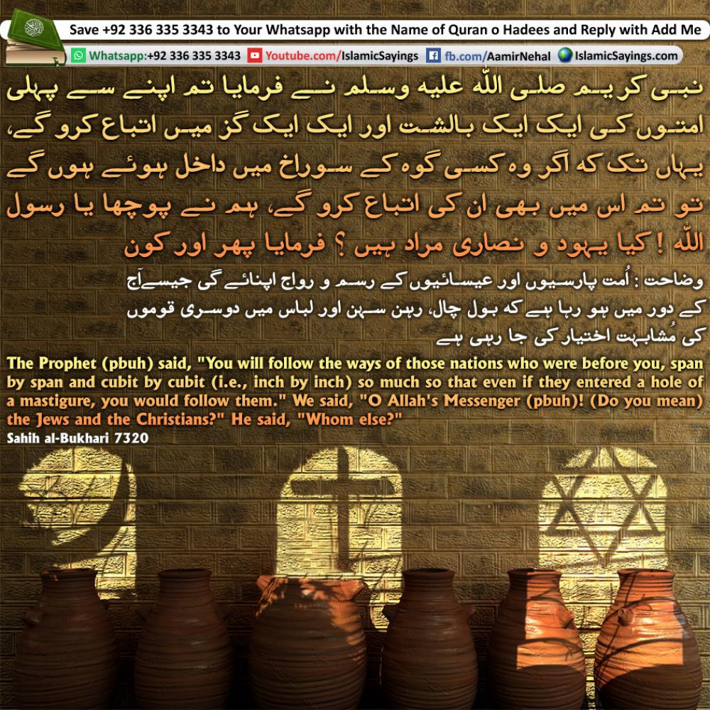 Narrated Abu Sa`id Al-Khudri: The Prophet said, You will follow the ways of those nations who were before you, span by span and cubit by cubit (i.e., inch by inch) so much so that even if they entered a hole of a mastigure, you would follow them. We said, O Allah's Apostle! (Do you mean) the Jews and the Christians? He said, Whom else?