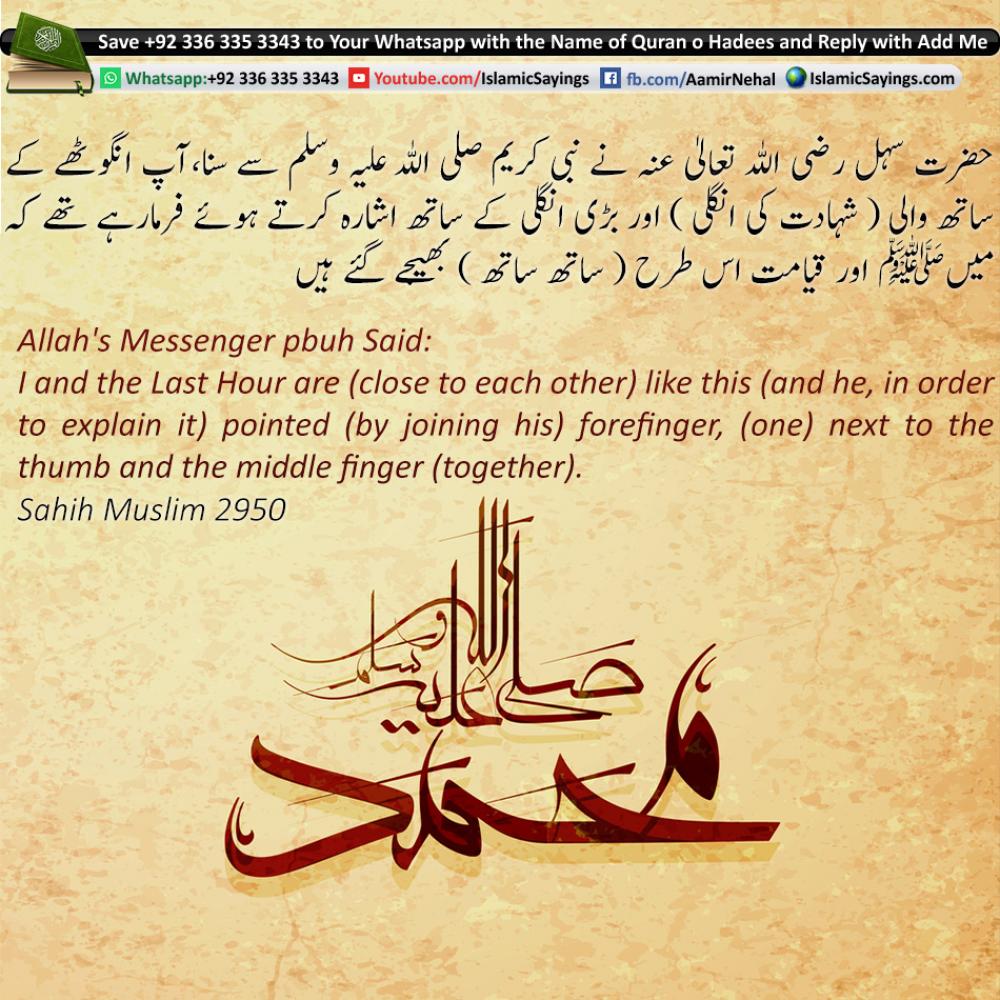 This hadith has been reported by Sahl b. Sa'd that he heard Allah's Messenger ( صلی اللہ علیہ وسلم ) as saying: I and the Last Hour are (close to each other) like this (and he, in order to explain it) pointed (by joining his) forefinger, (one) next to the thumb and the middle finger (together).