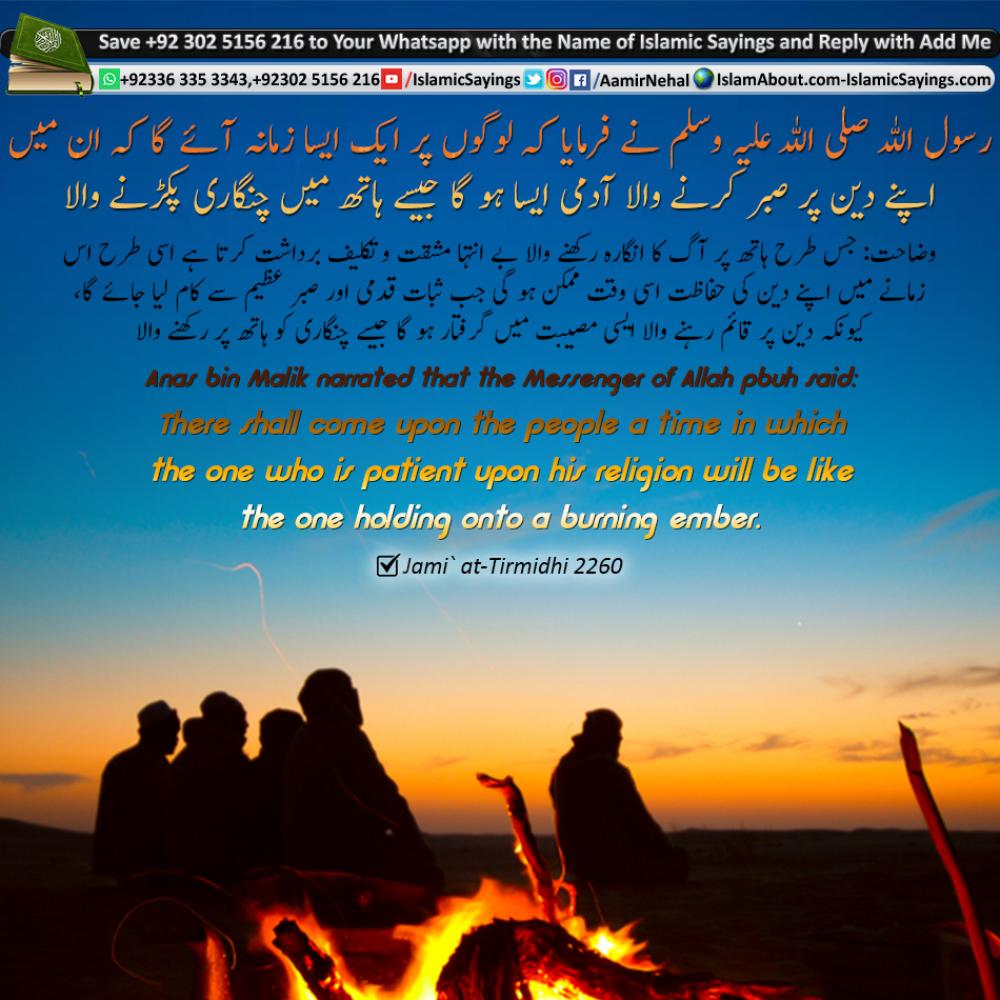Anas bin Malik narrated that the Messenger of Allah(s.a.w) said: There shall come upon the people a time in which the one who is patient upon his religion will be like the one holding onto a burning ember.